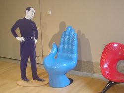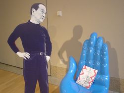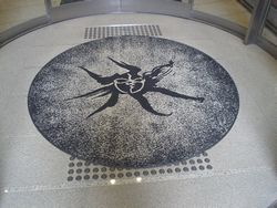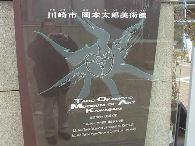 入り口のマットも岡本太郎デザイン。踏めません(笑)。 エントランスには「若い夢」の大きなオブジェ。 ここで、チケットを購入し、ロッカーに荷物を預けて、展示室に入ります。 (この時は特別展TARO賞≠フ展示があったため600円) 大阪万博関係をピックアップします。 展示室入り口で、いきなり「太陽の塔」の現在の顔がお出迎え。 岡本太郎年譜には、 「太陽の塔」の原型を試作している写真(1967年)、 テーマゾーン模型から顔を出す写真(1968年)。 「太陽の塔」の展示は、1/50(約1.4m)のが、ぐるぐる回転中。 その横のモニタには、製作に携わる太郎氏と万博の様子が。 展示室を出たところに、記念撮影コーナーがありました。